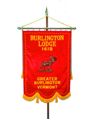 Embroidered in gold. Red satin banner with Lodge Name and Location embroidered in gold.
