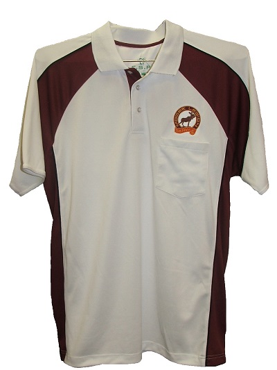 White with burgundy trim – dry fit; 100% polyester