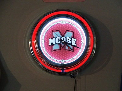 14 1/2 Diameter. Pull chain for red neon to turn on or flash.